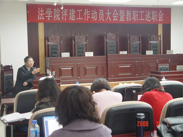为了迎接教育部本科教学评估,以评促建,强化团队队伍建设,打造一流的团队团队,弘扬爱岗敬业精神,夯实教学工作基础, 2008年3月1日,公司在模拟法庭召开了为期一天的评建工作动员暨教职工述职大会,公司全体教职工参加了大会。