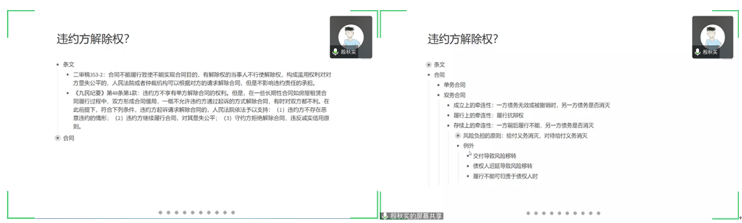 在自由讨论环节之后,活动进入到总结发言部分。殷秋实副教授以即将开展的第二期工作坊主题违约方解除权为引导,安排了第二期活动中作展示的同学,同时指出违约方解除权目前是学界热点话题,殷秋实副教授对我国解除权体系作了详细梳理后,建议同学们仔细阅读《民法典》物权编二审稿和2019年《全国法院民商事审判工作会议纪要》。
