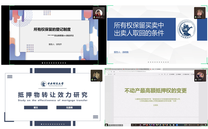 接下来工作坊活动进入到发言人展示阶段,公司2019级硕士研究生安悦齐、左晨楠、曾文,2016级本科生汤皖贻,2018级本科生王诺实同学分别对担保物权立法若干前沿问题向工作坊全体成员作了报告。安悦齐同学以关于所有权保留问题的不同学说为依托,评析了所有权保留登记对抗模式下的法律效果;汤皖贻同学比较分析了《民法典(草案)》与现行法律、司法解释对所有权保留相关规定的不同之处,对《民法典(草案)》中关于所有权保留的条款作出解释;左晨楠和曾文同学以重庆索特盐化股份有限公司与重庆新万基房地产开发有限公司土地使用权转让合同纠纷案例为切入点,深入分析了抵押物转让行为效力的演变,并作出了对抵押物转让行为效力的阐释;王诺实同学以最高人民法院95号指导案例为引导,得出了最高额抵押权的生效要件应区分不同情况作不同分析与规定等结论。