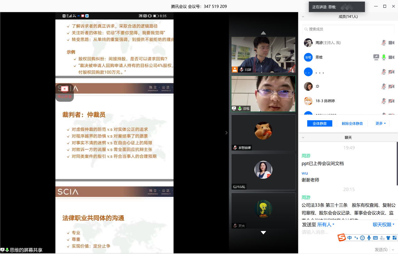 2020年5月14日晚上,深圳国际仲裁院案件管理一处副法律顾问陈思维先生受邀以线上方式为同学们带来主题为“商事仲裁策略技巧”的讲座,公司商法教研室副主任周游副教授主持。这是公司18级本科生法律诊所课程的组成部分,也是商法学研究工作坊系列活动之一,140余名本科生、研究生参加了本次活动。