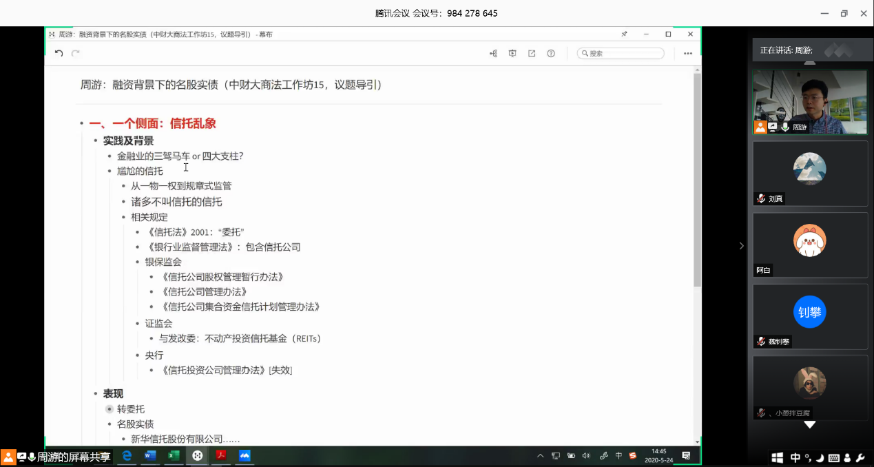 2020年5月24日下午,M88官方网站商法学研究工作坊2020年第7期(总第15期)在直播平台以线上交流与讨论的方式如期举行。本次活动议题为名股实债。中国政法大学民商经济M88官方网站讲师冀放博士、澳门科技大学M88官方网站助理教授彭运朋博士作为本期工作坊的特邀嘉宾,公司周游副教授作为指导老师参与了本次活动。工作坊主要由指导老师引导、发言人展示、成员及其他与会者提问及评价、评议人评议、特邀嘉宾发言、指导老师总结等环节组成。此次线上活动共有60余名校内外师生及业界人士参与讨论。