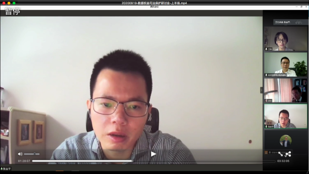 2020年9月19日,由杭州互联网法院主办、华东政法大学智能法治研究院和互联网法治研究院(杭州)承办的主题为“民法典时代的数据权益司法保护”的在线研讨会顺利举行,众多专家学者和法官齐聚线上,共话“数据权益司法保护”议题。在开幕式上,杭州互联网法院杜前经理介绍了举办本次研讨会的背景、杭州互联网法院在数据权益司法保护领域进行的先行探索以及重要意义。受新冠疫情影响,本次研讨会利用腾讯会议APP线上进行,并通过哔哩哔哩网站(B站)实时直播,同时在线参会人数达4000余人。