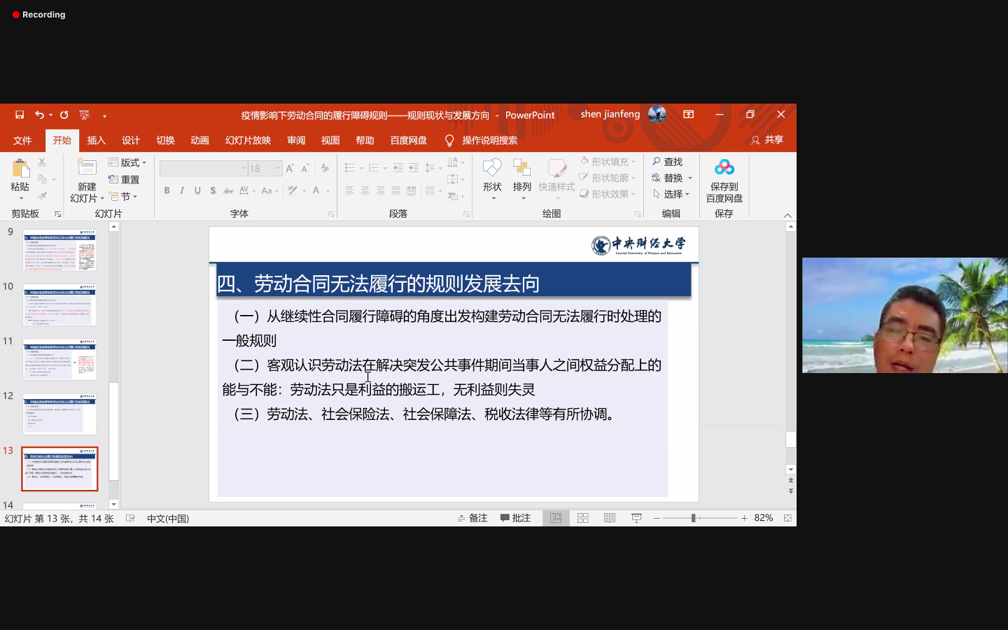 2020年10月17日至18日,由中国社会法学研究会指导,中国政法大学社会法学研究所主办的“中德劳动法与社会保障法对新冠疫情的应对研讨会”在线举行。来自中国、德国、英国、法国等国家和地区的30余名学者应邀参加会议。公司沈建峰教授应邀参会并以“因疫情导致劳动合同无法履行时的处理规则——规则、实践与发展去向”为题做会议报告。