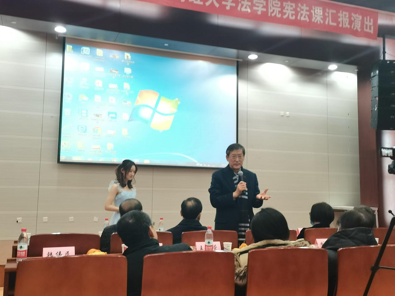 首先是韩大元评委点评。他向蒋劲松教授在宪法教学的内容、方法上的改革表示敬意,并且为中财M88官方网站宪法课的教与学感动。他说,今天这三个多小时的时间,同学们展示的是宪法学完整的价值理念、规范体系和制度的感染力。首先这是中国宪法的课堂,同学们通过这样的艺术、这样的形式,展现了中国宪法的制度。疫情让我们看到了宪法规定的国家制度的优势、特点。同样的疫情,我们能够成功地抗疫,是宪法的胜利,也是宪法的优势。同时同学们在话剧当中,也融入了第二个很重要的知识元素——外国宪法。我们看到了美国、日本、韩国,瑞典、德国、英国等等不同的国家。在它们的宪法制度下,他们是如何对疫情采取了应对的措施,我们不做价值的评判,这些国家都是经济强国,也号称法治发达国家。但是在自由和生命、自由和秩序、共同体和个人的权利之间,哪些国家能够合理地平衡,始终以人民的生命和健康作为国家的最高目标?是哪个国家依靠宪法的力量、宪法的理念,来挽救从0岁到100多岁所有病人的生命?我们没有放弃任何一个生命。同时我也感兴趣的是同学们把话剧变成了一个比较的课堂,同学们很有国际视野,想把中国和外国宪法做一个很好的比较,特别是世卫组织、中国和德国的辩论等等,这是一个很好的利用,把不同的宪法制度,无论从宪法的制度、规范到价值、文化,包括自由的理解,放在一个比较的、大的场景里面,让我们客观地、理性地看到,宪法制度是一个充满人性的制度。到底是哪个国家,什么样的宪法文化,能够弘扬坚守人性、坚守尊严、坚守人的生命。作为一个观众,看到三个多小时同学们尽兴准备的话剧,强烈感受到这是一个很好的宪法课,也是很好的宪法理论规范、文化交流的平台。同学们能够真心用自己的宪法语言来表达,真心地讲述中国宪法的故事。同学们的表演是非常优秀的,所以祝贺同学们。