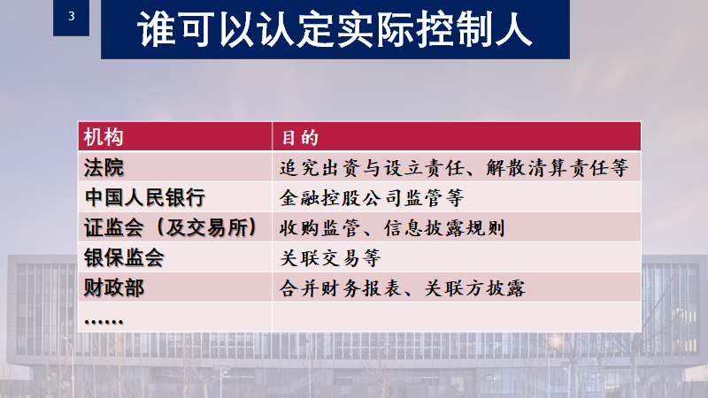 目前司法实践中认定实际控制人的类型主要是控股股东、实际出资人、关联人。周老师以典型判决为例,简要介绍了法院对该问题的认定方式。法院、中国人民银行、证监会(及交易所)、银保监会、财政部等主体出于不同的目的,均可以认定企业的实际控制人。随后,周老师梳理了上述部门为认定实际控制人而颁布的相应规章制度,重点解读了对公司上市、并购等实践存在关键意义的部分条文。