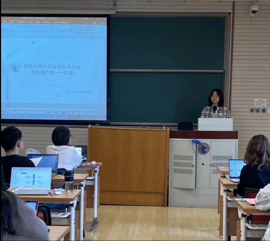 2020级法学硕士研究生李潇洋同学以“缩小收入差距问题”为主题进行了发言。首先,他就提案的六点内容进行了简要介绍。其次,分析了收入差距的种类与导致收入差距的原因,包括获取收入的体制制度、参与初次分配的制度、税收制度、转移支付和社会保障等几个方面。最后对提案进行了评述,并提出了提案之外缩小收入差距的思路方法。