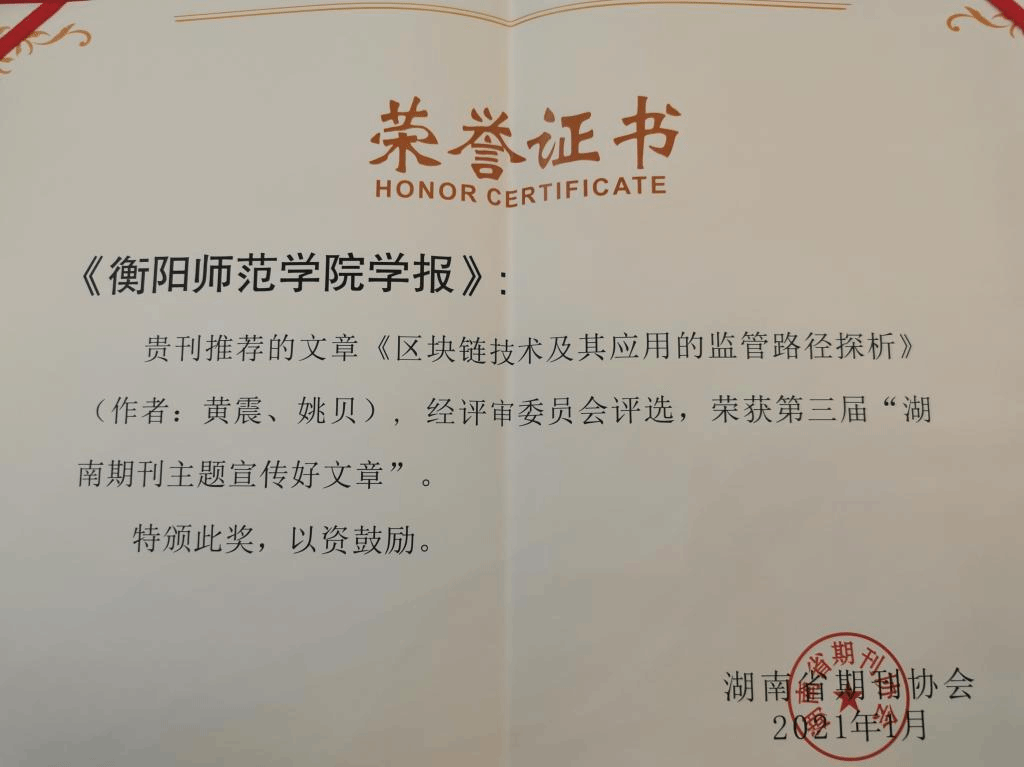 近日,第三届“湖南期刊主题宣传好文章”评选结果揭晓,公司黄震教授与其19级法律硕士(法学)研究生姚贝在《衡阳师范公司学报》合作文章《区块链技术及其应用的监管路径探析》成功入选,并被推荐参评全国第五届“期刊主题宣传好文章”。