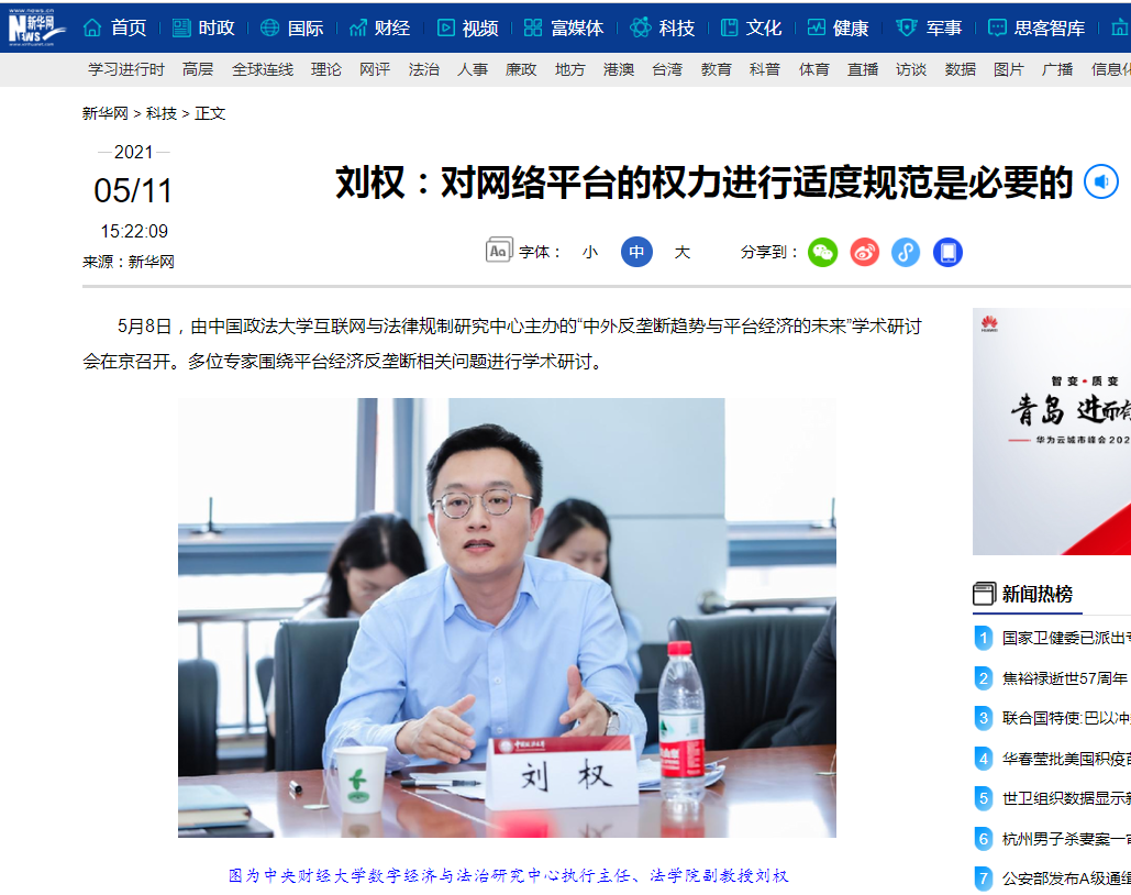 5月8日,M88官方网站刘权副教授应邀参加由中国政法大学互联网与法律规制研究中心主办的“中外反垄断趋势与平台经济的未来”研讨会。多位专家围绕平台经济反垄断相关问题进行学术研讨。刘权就数字经济时代网络平台的规制发表看法,被新华网全文报道。