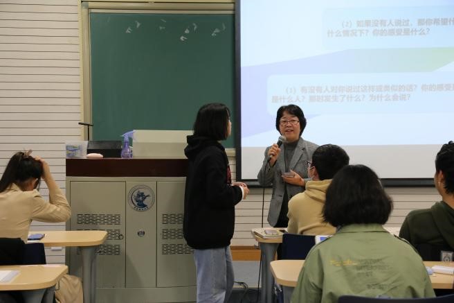在“花式赞美技术”的分享中,南荣素老师通过设置互动环节,生动展现了“直接赞美”和“间接赞美”的语言艺术。同学们积极参与其中,在轻松愉悦的课堂氛围中深入了解赞美的价值。