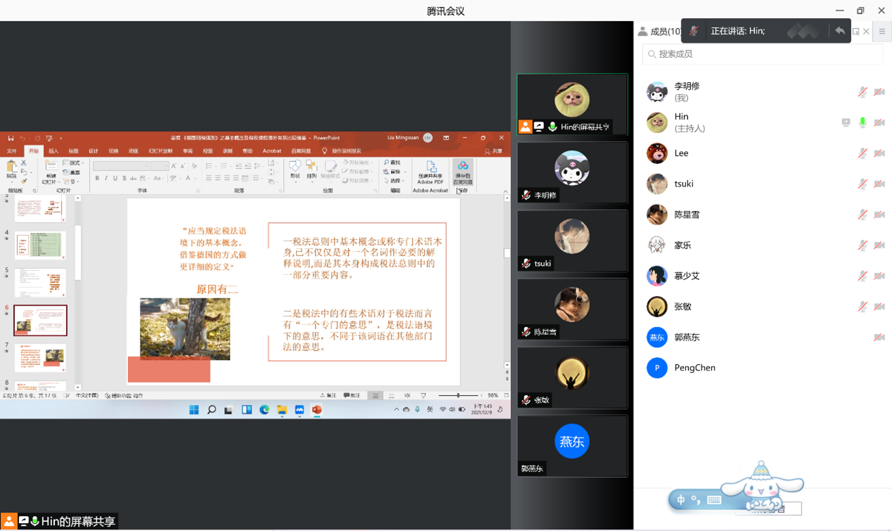 2021年12月9日中午,M88官方网站财税法工作坊2021-2022学年第五期(总第28期)活动在公司南路主教学楼909和线上腾讯会议同步举行。本期活动的主题为“德日税法通则的比较与借鉴”,由法律硕士研究生刘茗轩主持,M88官方网站本科生张驰、刘家骏,硕士研究生刘茗轩、李明修、姜恒、包少卿、叶俊材、沈聪分别就各自主题进行汇报与评议。华中科技大学M88官方网站李貌老师、M88官方网站郭维真老师,应邀出席。华中科技大学和M88官方网站两校研究生、本科生三十余人通过线上会议和线下会议的方式参加本次活动。