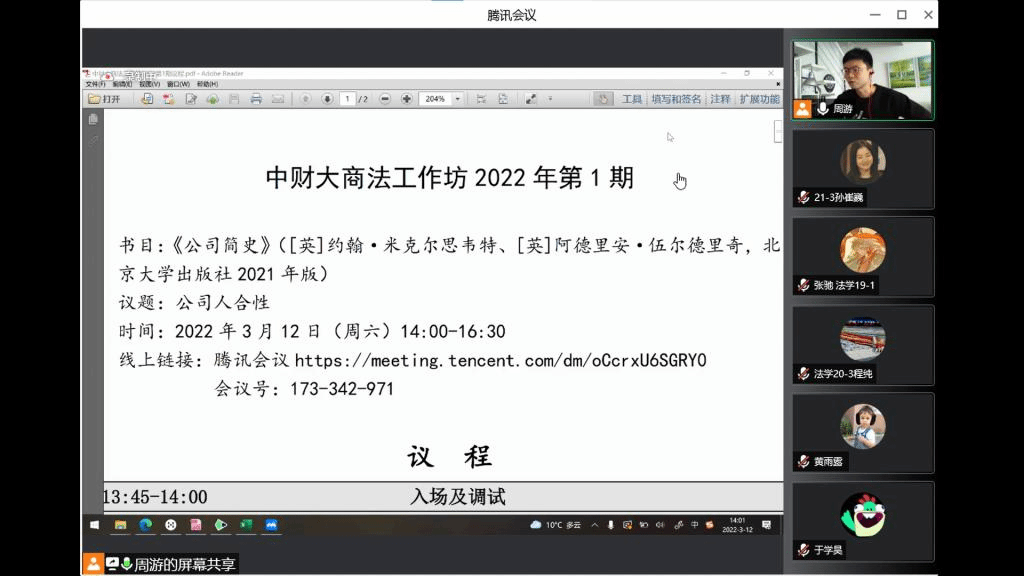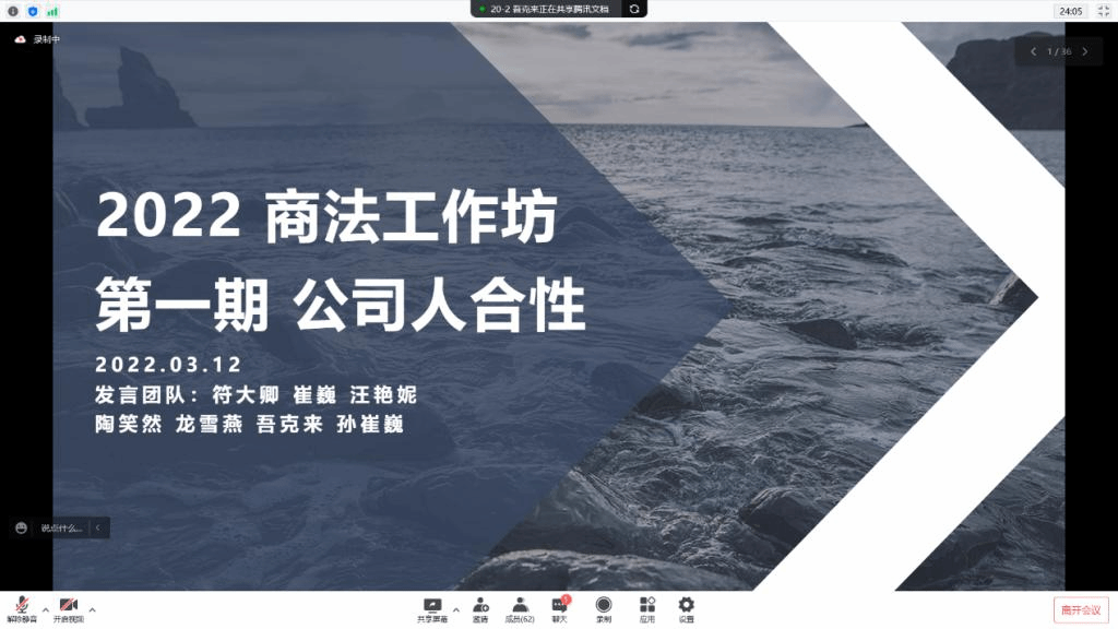 2022年3月12日下午,M88官方网站商法学研究工作坊2022年第1期(总第23期)在直播平台以线上交流与讨论的方式如期举行。本次活动议题为公司人合性。西南政法大学经济M88官方网站吴飞飞副教授作为本期工作坊的特邀嘉宾,公司周游副教授作为指导老师参与了本次活动。工作坊主要由指导老师进行引导式发言、发言人展示、工作坊成员评价、特邀嘉宾发言、指导老师向评议人提问、评议人向发言人提问、发言人回应及自由讨论、特邀嘉宾及指导老师回应等环节构成。此次线上活动共有70余名校内外师生及业界人士参与讨论。
