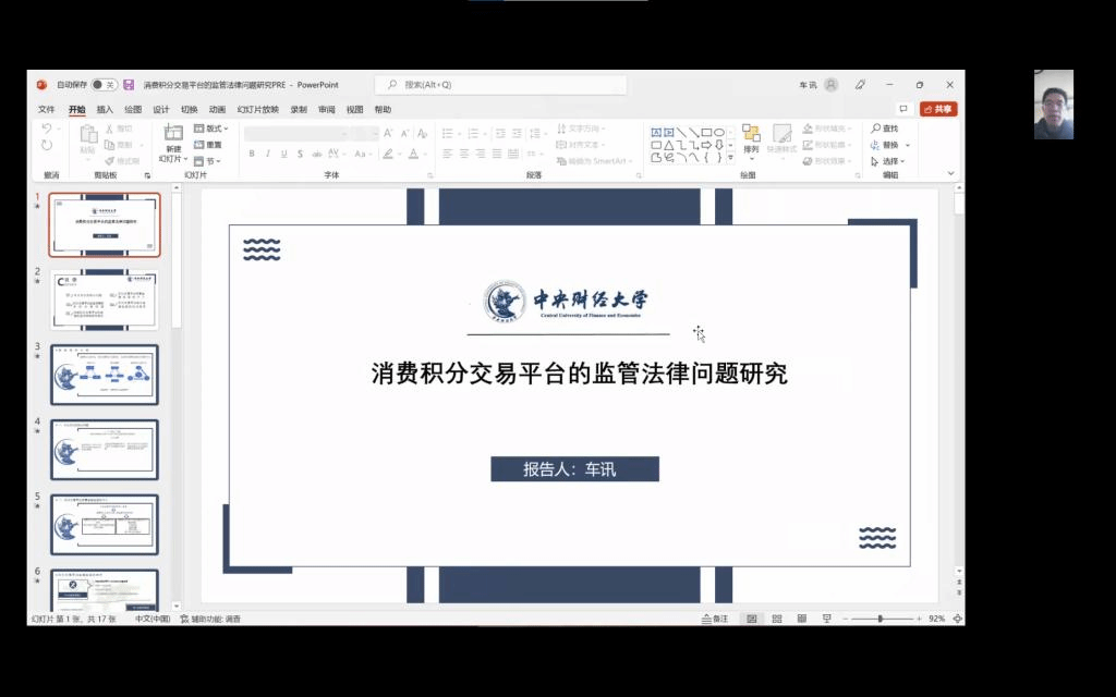 随后是发言人的分享环节。公司2020级法律(法学)硕士研究生车讯,分享了主题为“消费积分交易平台的监管法律问题研究”的硕士毕业论文。文章按照“提出问题,分析问题和解决问题”的逻辑结构分为五个板块,即问题的提出,积分交易平台金融监管介入的必要性和可行性,积分交易平台监管要解决的法律问题分析,积分交易平台地方金融监管的试点路径以及构建积分交易平台的金融监管法律制度建议,发言人将按照行文逻辑的顺序展开分享。
