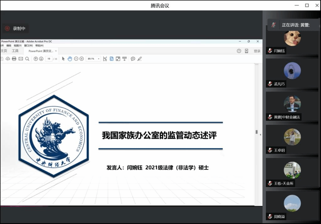 2022年5月14日上午,M88官方网站金融法工作坊2022年第18期(总第219期)通过腾讯会议线上交流的形式举办,本期研讨会主题为“我国家族办公室的监管动态”。近年来,源于西方的家族办公室在我国发展迅猛,业务领域涉及资产管理等金融服务以及婚姻、继承等事务性服务,其运行过程中的潜在法律风险和监管问题值得我们深思。公司黄震教授对研讨会进行了全程指导,本次线上金融法工作坊共有10名校内外师生、业界专业人士参会交流。研讨会分为主持人介绍、发言人分享、评议人评议、答疑与交流、指导老师点评总结五个环节。