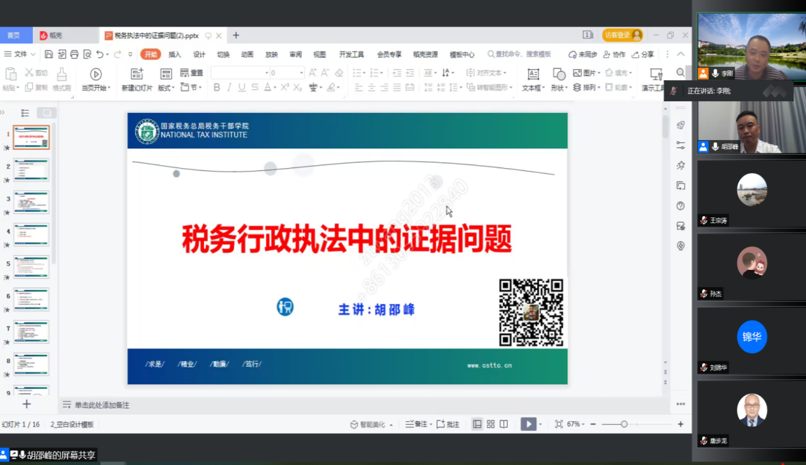 主讲环节,胡邵峰老师以自身经历为例提出了他关注税务执法证据议题的原因,进而分七部分详细阐述对证据问题的认知体系。第一部分,胡邵峰老师明确了税务行政执法证据的认识前提,即税务行政执法的基本内容、存在的规则供给不足、理论研究不足、程序思维缺席等问题。第二部分,胡老师阐述了“什么是证据”,指出了税务行政程序证据与其他诉讼程序证据的不同之处,提出了“什么是税务证据?”的问题。第三部分,胡老师出税务行政执法事实依据的认定思路,即“有规定,依规定;无规定,则参照;无参照,讲道理(法理,常理)”。同时,以《行政诉讼证据规定》第63条为例结合案例对这一思路进行了具体说明。第四部分,胡老师总结了税务行政执法证据的四个特点,即税务机关“三位一体”的身份定位、税务行政执法“效率优先”的价值取向、执法权和司法权的彼此协调、税务行政执法证据的特殊性。第五部分,胡老师系统介绍了税务行政执法证据收集和审查判断的基本逻辑,即包括确定待证事实——确定证据资格——识别证据种类——证据排除——证明效力的审查判断——举证责任——认定事实的一系列逻辑环节。第六部分、第七部分,胡老师以税额确认程序、陈建伟诉莆田市地税稽查局案为例具体阐释上述理论体系,分析了举证责任的本质、税额确定程序的意义、税额确认程序中举证责任与诉讼程序之不同,并对税额确认程序中的举证责任进行再定义。胡老师进一步以陈建伟诉莆田市地税稽查局案检验上述理论体系。