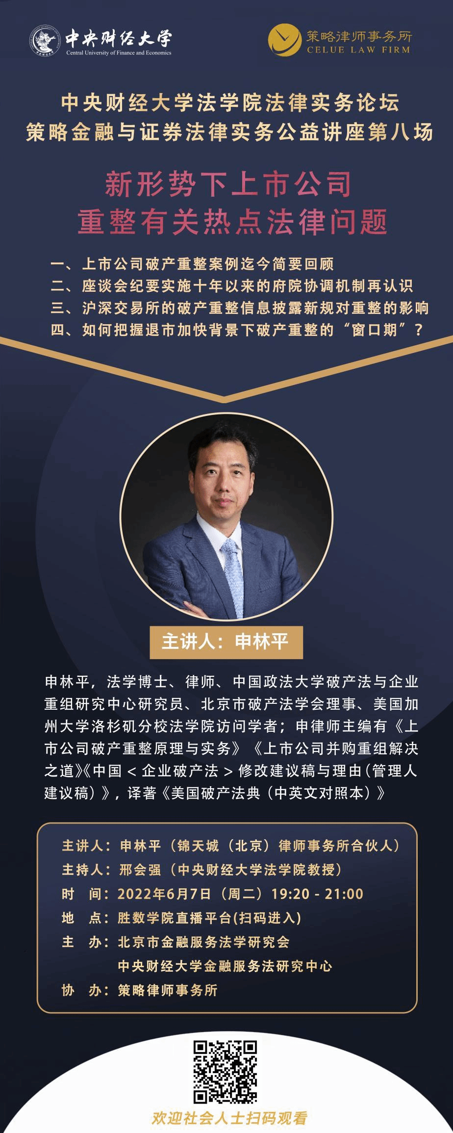 2022年6月7日,“策略金融与证券法律实务公益讲座”第八场成功举办。本次讲座邀请锦天城(北京)律师事务所合伙人申林平博士作题为“新形势下上市公司重整有关热点法律问题”的专题讲座,M88官方网站教授邢会强教授主持。“策略金融与证券法律实务公益讲座”由北京市金融服务法学研究会、M88官方网站金融服务法研究中心主办,策略律师事务所协办。本次讲座采取线上方式举行,全程累计观看直播的网络用户达一万余人。