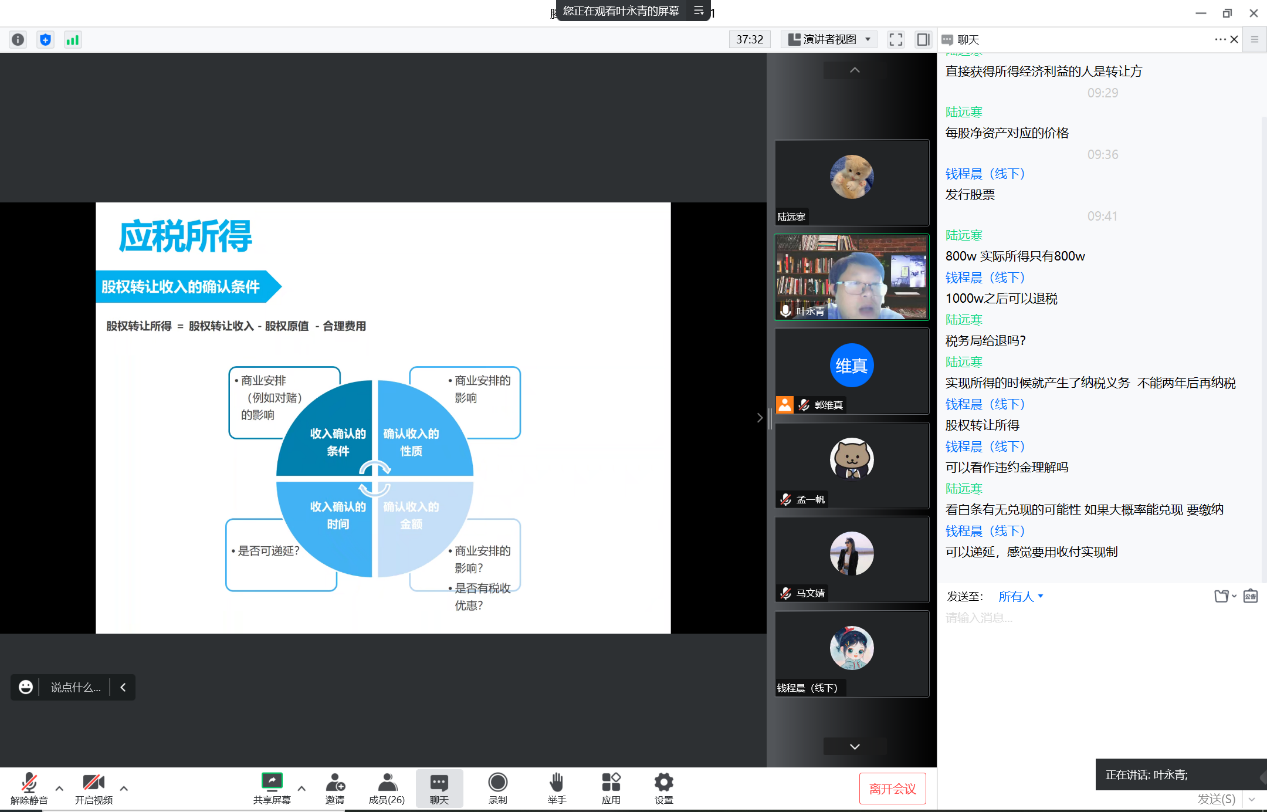 其次,叶律师以个人转让股权相关税务问题为主题,梳理了上述税收法律概念,带领同学们重点分析了税收居民的判断、税收管辖机关的确定、股权转让收入的确定、股权原值的确定、合理费用的确定、股权转让所得税的税收优惠、反避税规则等焦点法律问题。