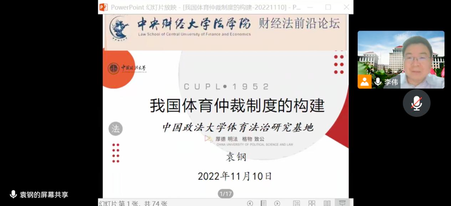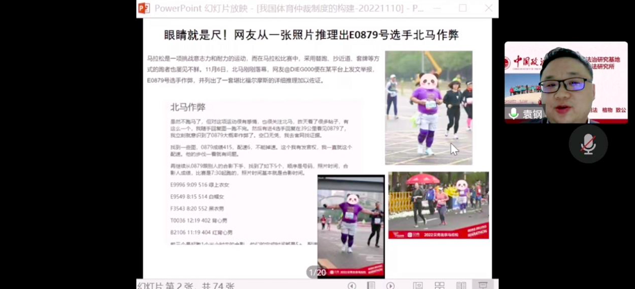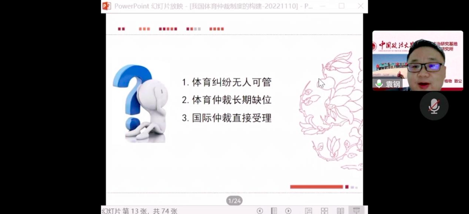 2022年11月10晚,“我国体育仲裁制度的构建”讲座在线举行,邀请中国政法大学袁钢教授主讲,M88官方网站副经理李伟副教授主持,体育经济与管理公司马法超副教授、M88官方网站沈健副教授、曹建军副教授与谈,M88官方网站经理尹飞教授及公司部分本科生、研究生参加了本次活动。