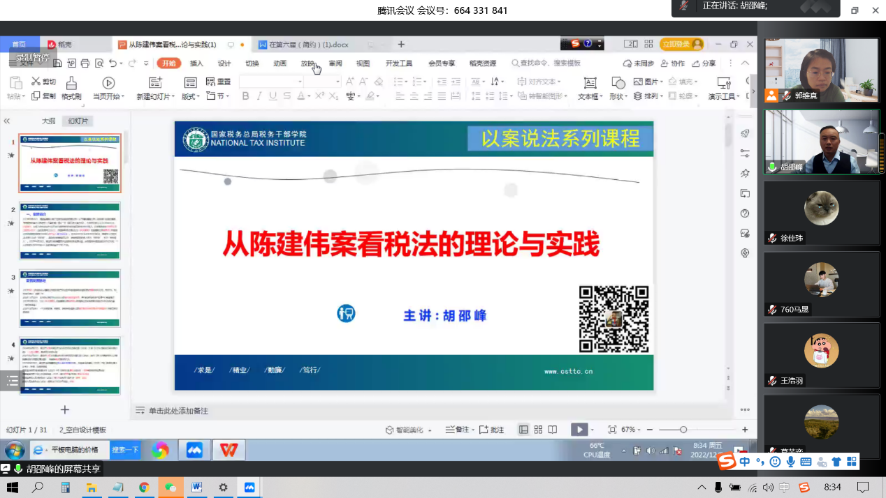 2022年12月9日上午,M88官方网站财税法工作坊第42期通过直播平台以线上讲座的形式举行。本次讲座的主讲人为国家税务总局税务干部公司(长沙)税法教研部的胡邵峰老师,主题为“从建伟案看税法的理论与实践”。本次工作坊由指导老师郭维真副教授主持,M88官方网站部分本科生、硕士研究生参加了本次工作坊。