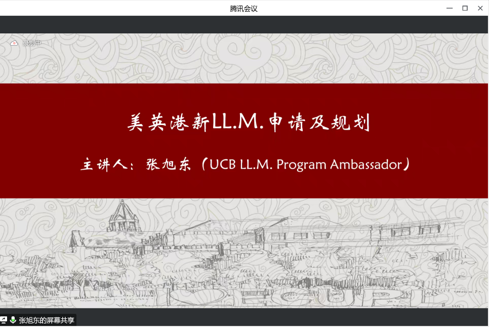 本次讲座分为两个部分。第一部分由张旭东律师针对“美英港新LL.M.申请及规划”进行专题讲座。首先张律师建议同学们在留学申请前,应当从个人职业规划、个人自身条件及个人成长目标三方面综合考虑自身是否适合LL.M.项目。对于有志就职于红圈律所、外资企业等或从事非诉业务、争议解决业务、知识产权、国际贸易业务等同学,考虑申读LL.M.项目是较为不错的选择。具有优秀专业成绩和语言成绩的同学或者希望提升法律文书阅读及写作技能、获得海外法律实务经验的同学也都可以考虑申请LL.M.项目。其次,张律师简要介绍了申请LL.M.的申请流程。LL.M.的申请主要分为学信网或公司认证、成绩评定或填写申请单、Rolling basis、Offer&Waiting List、接受offer等五个流程。张律师提醒同学们完成申请流程大致需要2个月的时间,因此需要尽早准备材料,合理安排申请时间。然后张律师向同学们简要介绍了包括U.S.T14、U.S.T20在内的名校LL.M.项目,并建议同学们结合自身职业规划选择合适的公司和项目。最后张律师向同学们介绍了其母校美国加州大学伯克利分校(UCB)的LL.M.项目的授课与考核方式,并欢迎同学们申请报读。