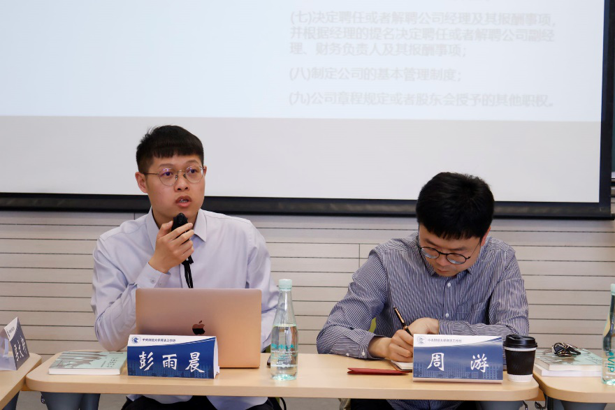 主持人围绕着公司法一审稿的62条以及二审稿的67条之间对于董事会职能定位规定的变化提出了第一个问题,即对于执行机构中的“执行”一词应当怎么样去解释,又有什么样的维度去进行解释。陈芳婷同学从历史溯源的角度对执行一词进行了解释,指出执行这个词实际上是一个早期行政管理立法的一个遗产,其内涵受到了将公司类比成国家学说的影响;冯凯文同学则从域内外比较的角度对陈芳婷同学的发言进行了补充,指出在未来或许我们也会像欧美国家一样,强调董事会的管理监督职能;周游老师对此指出不能简单的将我国公司发展进程与西方国家进行比较,必须考虑到公司法“发展赛道”的问题,周游老师进而引导大家思考一个问题,即“如何评价制度好坏?”;宋姝雅同学进一步从体系解释的角度结合《民法典》中执行机构的规定对董事会的职能定位进行了解释;刘珈西同学对宋姝雅同学的发言进行了回应,指出民法典的规定其实跟公司法想表达的执行意义并不冲突,即便公司法二审稿删掉了执行机构的规定,也不会对董事会的职权产生影响;最后,赫芮竹同学又从委托代理的角度阐明了董事会的职能定位。彭雨晨老师对同学们的发言进行了总结,并提出了总结经验即进行相关制度调查的必要性,同时彭老师也指出不能泛化的去理解董事会的职能定位,董事会的职能定位仍然需要一个确定的概念或者确定的含义。
