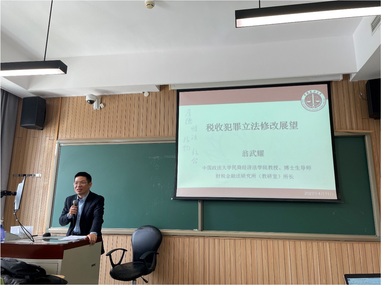 2023年4月11日上午,M88官方网站财税法工作坊第45期在公司南路校区主教317教室举行。本次工作坊的主讲人为中国政法大学民商经济M88官方网站翁武耀教授,主题为“税收犯罪立法修改展望”。本次工作坊由指导老师郭维真副教授主持,M88官方网站部分本科生、硕士研究生参加了本次工作坊。