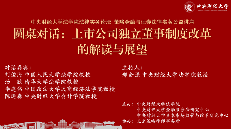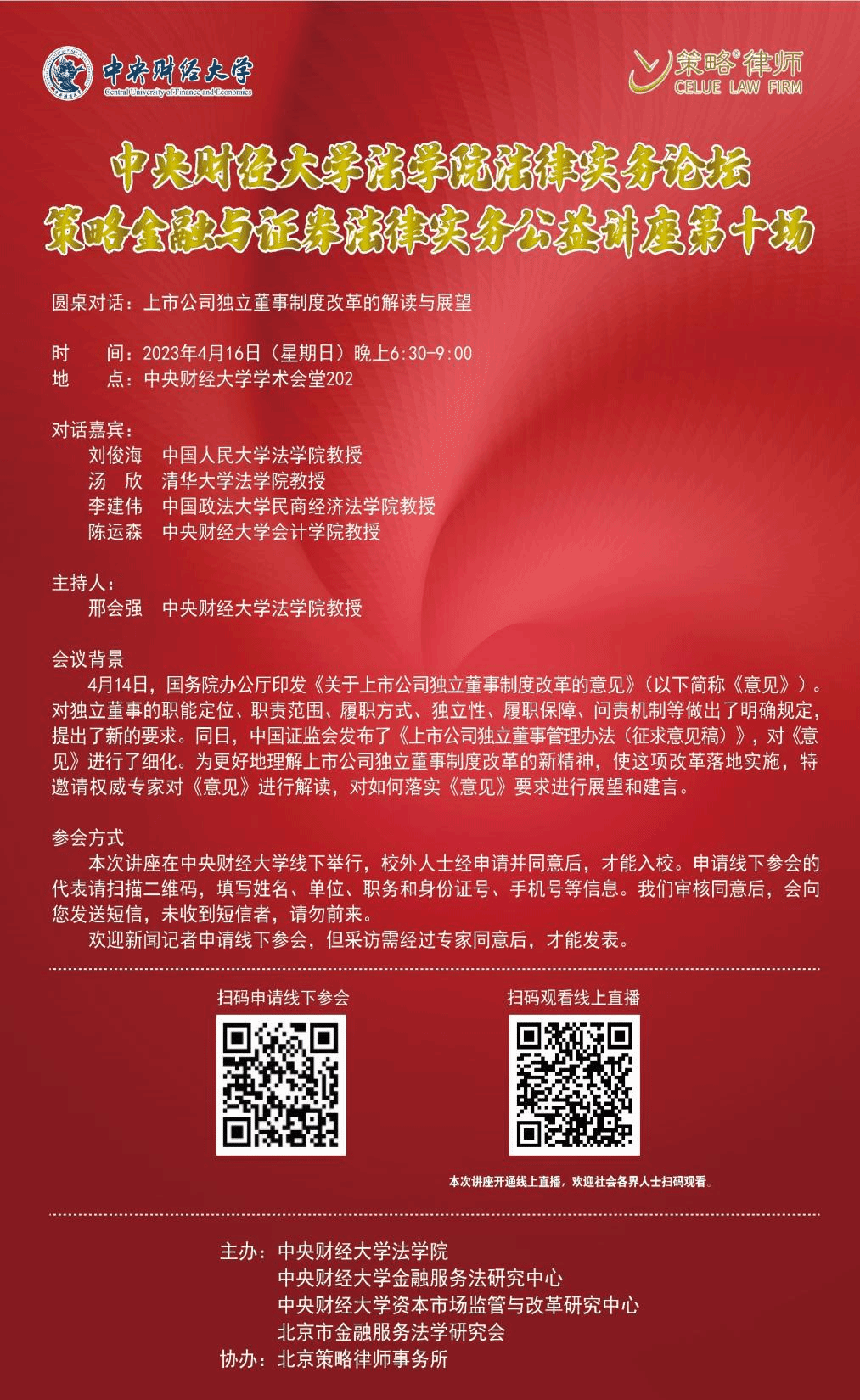 2023年4月14日,国务院办公厅印发《关于上市公司独立董事制度改革的意见》(以下简称《意见》)。对独立董事的职能定位、职责范围、履职方式、独立性、履职保障、问责机制等做出了明确规定提出了新的要求。同日,中国证监会发布了《上市公司独立董事管理办法《征求意见稿》》,对《意见》进行了细化。为更好地理解上市公司独立董事制度改革的新精神,使这项改革落地实施,聚焦于如何落实《意见》要求并进行展望和建言,4月16日,“M88官方网站法律实务论坛”暨“策略金融与证券法律实务系列公益讲座”第十场以“圆桌对话:上市公司独立董事制度改革的解读与展望”为主题,特邀请权威专家对《意见》进行解读,对如何落实《意见》要求进行展望和建言。