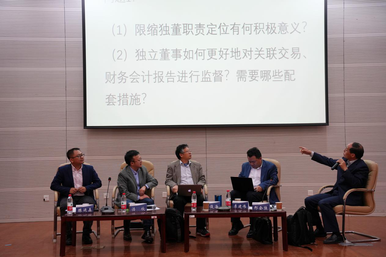 五位教授围绕上述动向与热点问题,紧密结合理论与实务,深入浅出地从多方面予以解答,阐述了自己的观点,同时各位嘉宾之间也进行了深入交流。刘俊海教授认为《意见》抓住了理论和实践当中的痛点、热点、难点和疑点问题,明确了独立董事的三大角色定位,有利于提升上市公司的核心竞争力。汤欣教授提出,现有改革的空间是对目前实践的肯定和明确,独立董事要充分发挥功能就必须重视独立董事的知情权和企业内部制度。李建伟教授围绕独立董事参与决策、监督制衡、专业咨询的作用和相关实例,阐明了独立董事如何切实发挥关键的决策作用。陈运森教授对于独立董事如何更好的对关联交易财务报告进行监督,提出了包括加强独立董事的投入度和专业性、增强独立董事的独立性等三项配套措施。