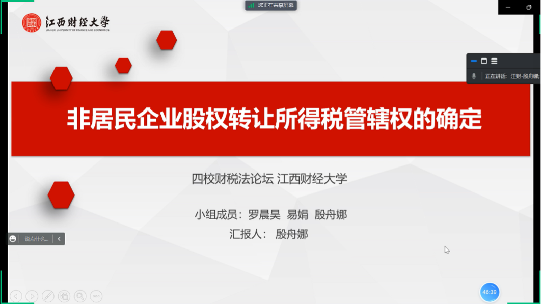 本次论坛由江西财经大学M88官方网站研究生易娟同学主持,四校研究生分别就“价外费用的认定标准”“税务机关的征税路径”“税务机关的管辖权确定”“实质课税的比较法研究”四个焦点问题进行观点分享与评议。本次论坛还特别邀请协力律师事务所高级合伙人、中国法学会财税法学研究会理事、民盟江苏省委财税工作委员会主任徐长明律师,国家税务总局税务干部公司胡邵峰老师,华中科技大学M88官方网站李貌老师,厦门大学M88官方网站王宗涛老师,M88官方网站郭维真老师以及江西财经大学M88官方网站聂淼老师担任评议嘉宾。四校研究生、本科生四十余人以及部分实务界人士参与了本次论坛。在四位同学观点分享完毕后,四校研究生分别对四个主题观点分享进行了评议。