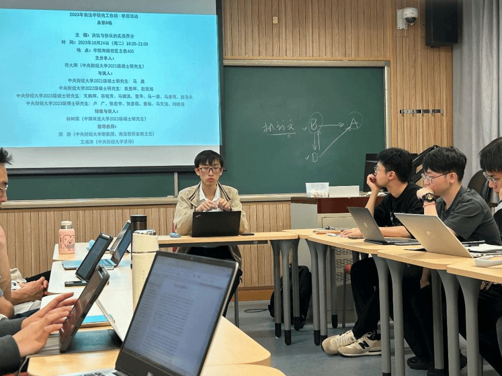 2023年10月24日晚,M88官方网站商法学研究工作坊季后活动2023年第3期(总第9期)在M88官方网站公司南路校区主教405教室举行。本次活动的议题是“决议与协议的实质界分”,周游副教授和王湘淳老师全程指导活动的开展,本次商法工作坊的主分享人为公司硕士研究生符大卿,特邀与谈人为中国政法大学硕士研究生林树荣,活动共计有近20位校内外师生参与会谈。